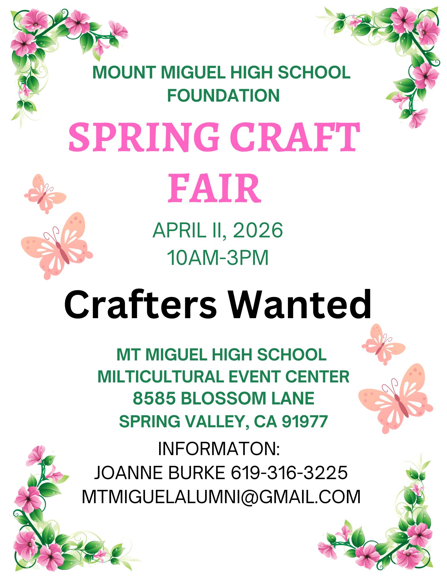 Crafters Wanted! The Mt. Miguel High School Foundation is seeking vendors for our Spring Craft Fair On Saturday, April 11, 2026, 10 AM – 3 PM, at Mt. Miguel HS Multicultural Event Center Handmade goods, art, jewelry, décor & specialty items welcome!